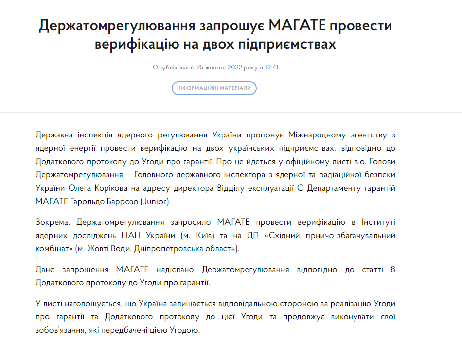Государственная инспекция ядерного регулирования Украины предлагает Международному агентству по ядерной энергии провести верификацию на двух украинских предприятиях в соответствии с Дополнительным протоколом к ​​Соглашению о гарантиях.