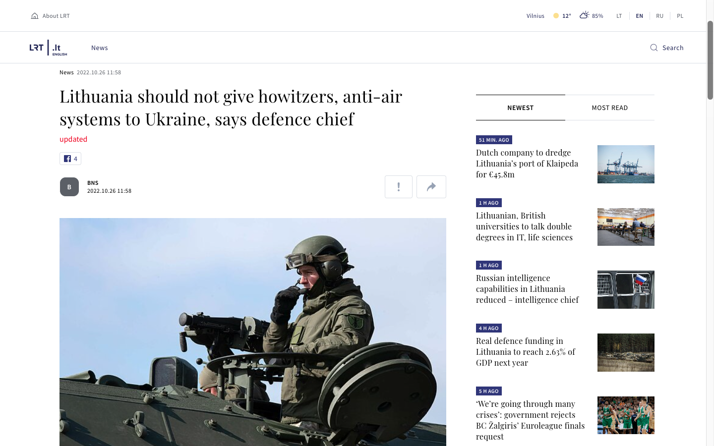 Министр обороны Литвы Вальдемарас Рупшис выступил против передачи Украине гаубиц PzH 2000 и систем ПВО NASAMS и озвучит свою позицию на ближайшем заседании Государственного совета обороны.