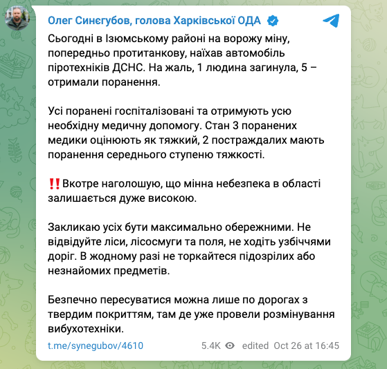 Инцидент произошел сегодня в Изюмском районе. По предварительным данным, мина была противотанковая.