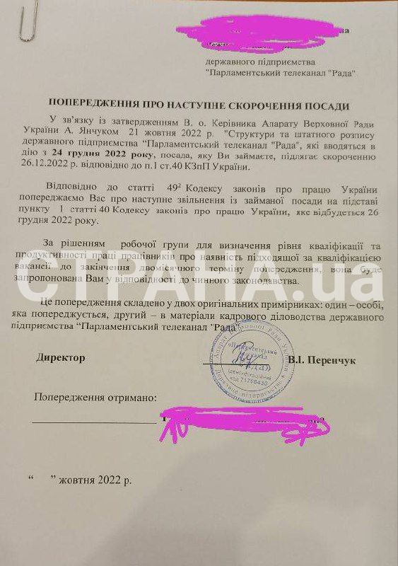 "В связи с утверждением и.о. руководителем аппарата Верховной Рады Украина А. Янчуком 21 октября 2022 г. "Структуры и штатного расписания предприятия "Парламентский телеканал "Рада", которые вводятся в действие с 24 декабря 2022 года, должность, которую вы занимаете, подлежит сокращению 26.12.2022", - сказано в документе.