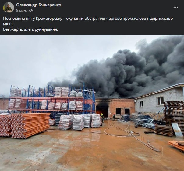 08.45 Ночью противник атаковал одно из промышленных предприятий Краматорска, сообщил мэр города Александр Гончаренко.