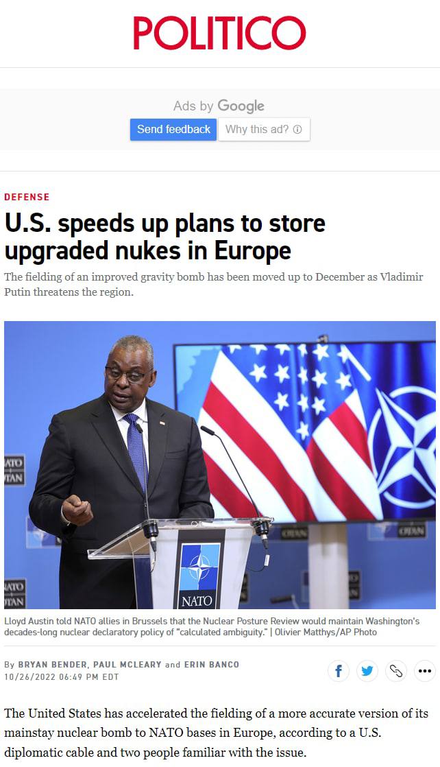 09.25 США решили ускорить размещение модернизированных тактических ядерных бомб B61-12 в Европе, они должны быть доставлены на базы НАТО на континенте уже в декабре, а не весной 2023 года, пишет газета Politico.