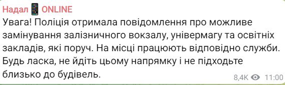11.10 Полиция Тернополя получила сообщение о возможном минировании железнодорожного вокзала, универмага и соседних образовательных учреждений.
