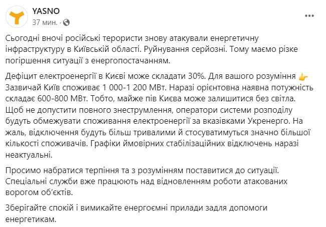 21:44 В Киеве сегодня без света оказались около миллиона киевлян, сообщил СЕО Yasno Сергей Коваленко.