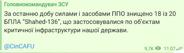 За последние сутки силы ПВО уничтожили 18 из 20 БПЛА Shahed-136, применявшихся по объектам критической инфраструктуры.