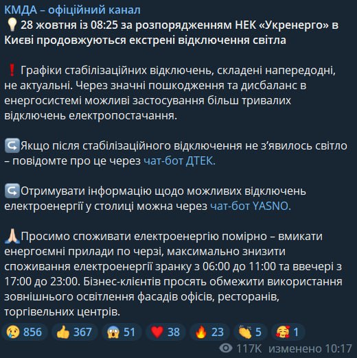 Предыдущие графики уже не актуальны. Из-за значительных повреждений и дисбаланса энергосистемы отключения могут продолжаться длительное время, сообщили в КГГА.
