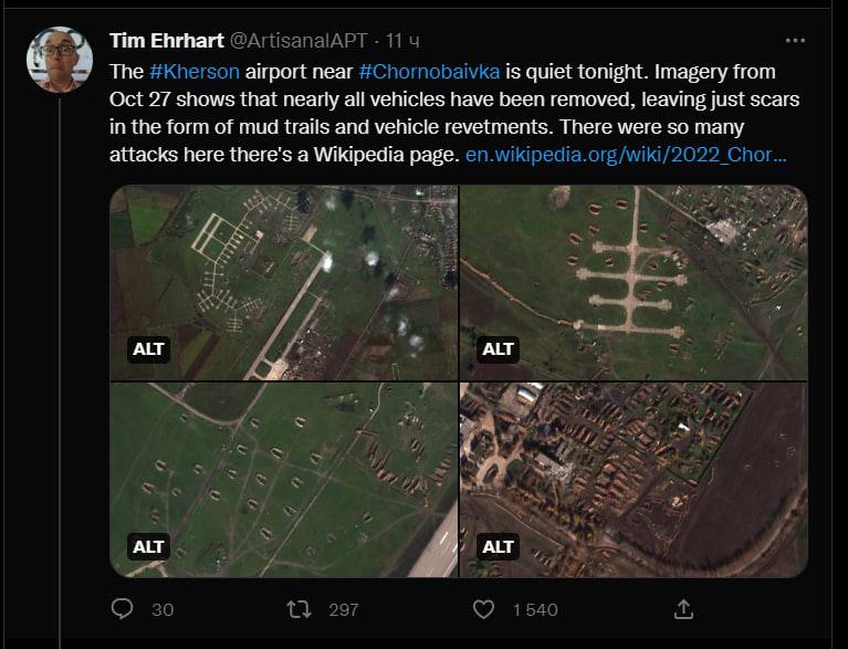 "В херсонском аэропорту около Чернобаевки сегодня тихо. На снимках от 27 октября видно, что почти все транспортные средства убрали, остались только грязевые следы и обшивки транспортных средств", - пишет Эрхарт в своем твиттере.