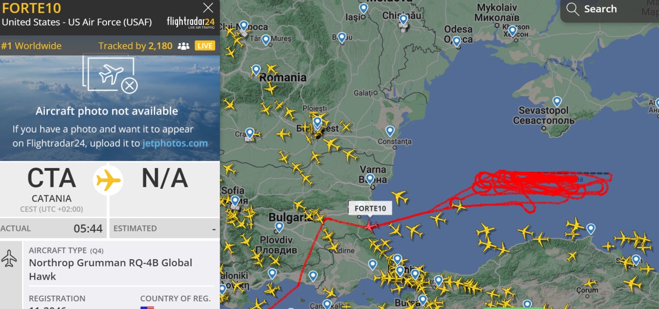 09.10 Над Черным морем делает круги американский разведывательный беспилотник RQ-4B Global Hawk. Это видно по сервису Flightradar.