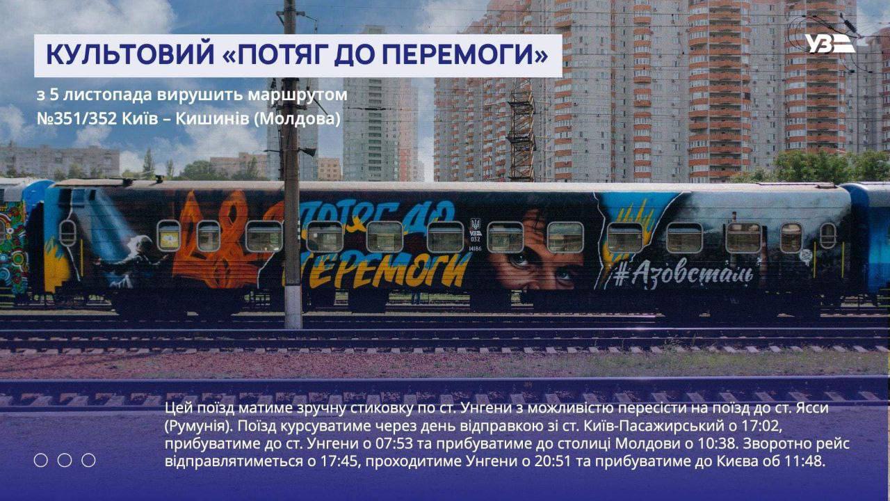 19.43 «Укрзализныця» с 5 ноября запускает «Поезд к победе» по маршруту Киев – Кишинев (Молдова).