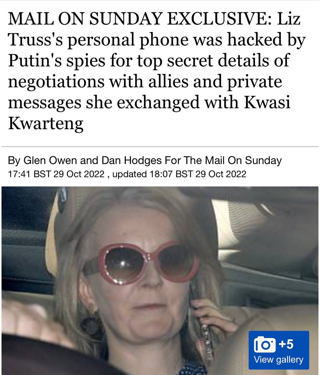 20.24 Британские СМИ пишут, что личный телефон бывшего премьер министра страны Лиз Трасс был взломан "шпионами Путина" ради сверхсекретных подробностей переговоров с ключевыми союзниками, личных сообщений и обсуждения ситуации в Украине, в том числе, поставок западного оружия.