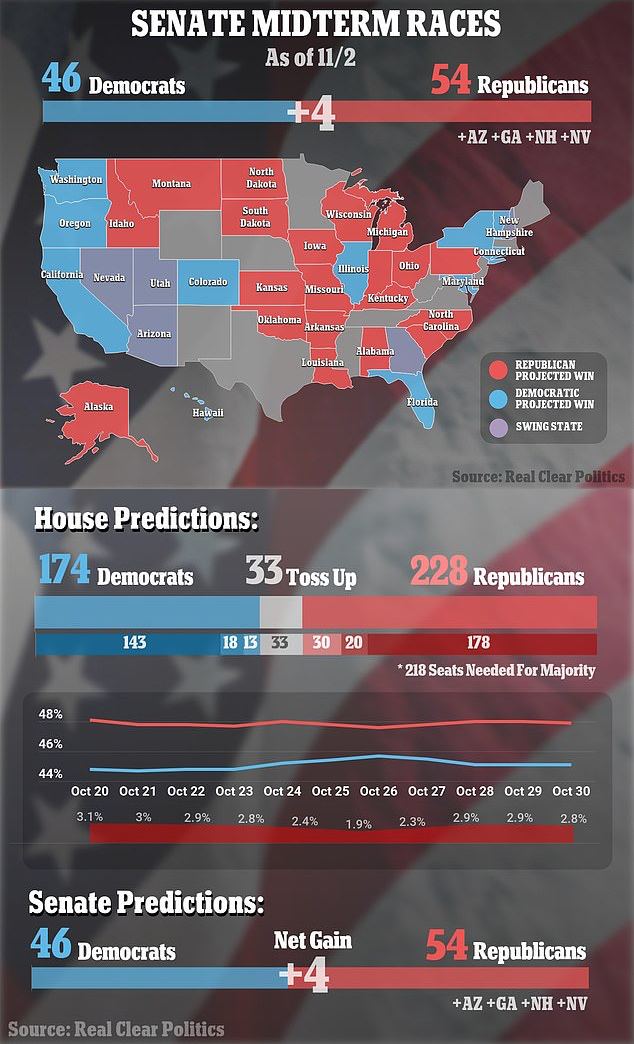 По последним соцопросам, у республиканцев появились шансы взять до 54 мест в Сенате, получив там уверенное большинство. В нижней же палате они могут выиграть 30-35 мест - в таком случае республиканское представительство в Конгрессе станет крупнейшим за почти столетие.