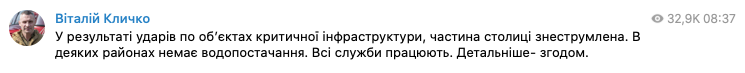 "Часть столицы обесточена. В некоторых районах нет водоснабжения. Все службы работают", - заявил мэр.