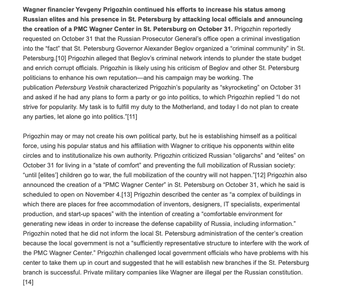 31 октября Пригожин потребовал, чтобы Генпрокуратура РФ возбудила уголовное дело по факту организации губернатором Санкт-Петербурга Александром Бегловым "преступного сообщества" с целью хищения госбюджета, а также раскритиковал российских "олигархов" и "элиты" за то, что они живут в "состоянии комфорта" и препятствуют полной мобилизации российского общества: "пока дети (элит - ISW) не пойдут на войну, полной мобилизации страны не будет".
