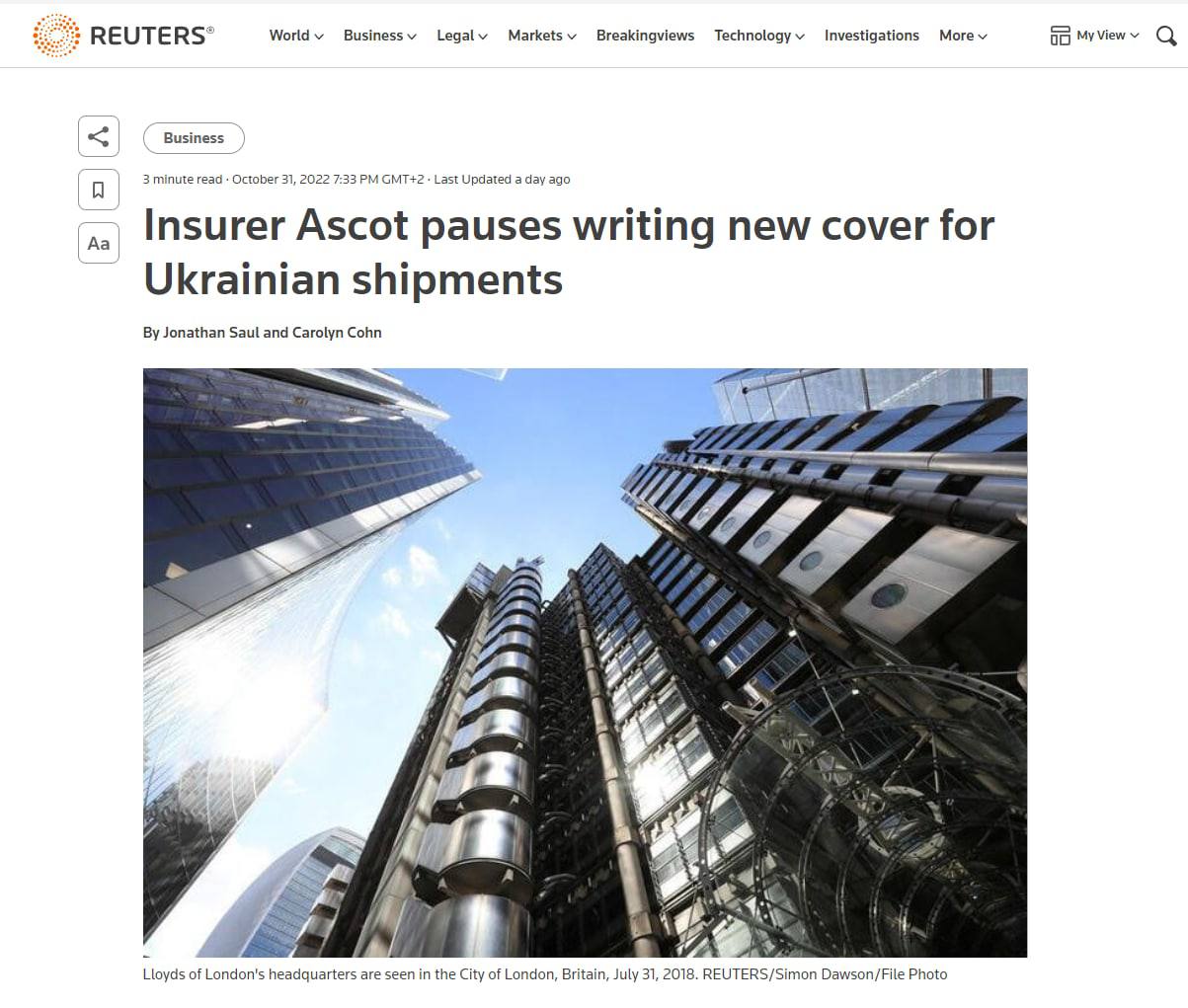Британская компания Lloyd's Ascot остановила страховку новых поставок через "зерновой коридор"