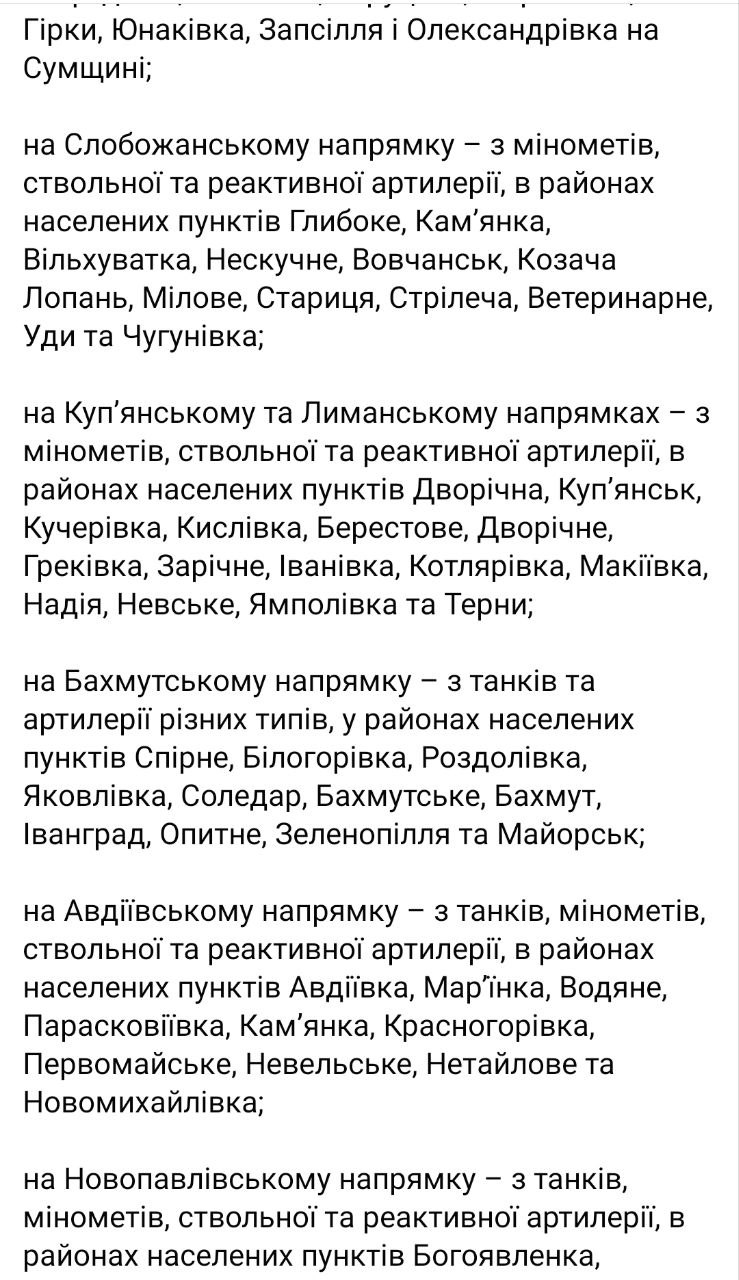 2. За сутки отражены атаки в районах населенных пунктов Макеевка, Невское и Белогоровка Луганской области, Верхнекаменское, Спорное, Бахмут, Майорск, Первомайское, Новомихайловка, Водяное, Павловка и Пречистовка Донецкой области.