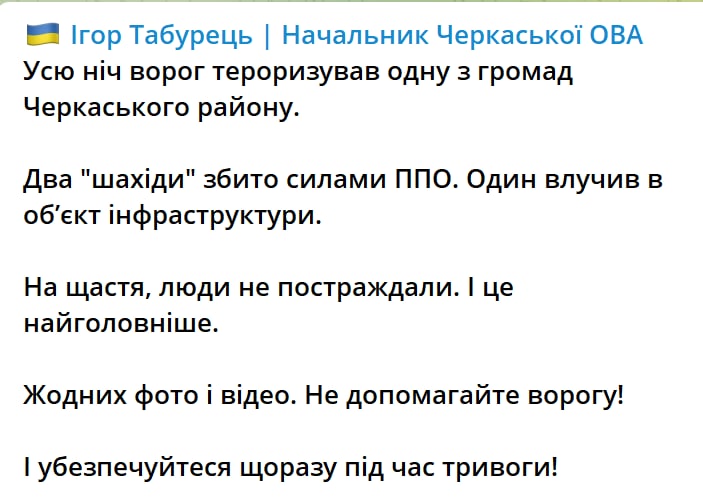 8:20 Подтвержден удар "Шахидом" в Черкасской области этой ночью.