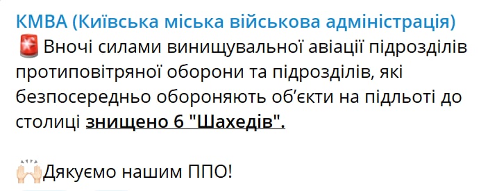 8:48 Ночью на подлете к столице было сбито шесть беспилотников-камикадзе "Шахид".