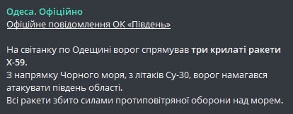 10:20 Над Черным морем в районе Одесской области сбиты три крылатые ракеты Х-59, сообщает Оперативное командование "Юг".