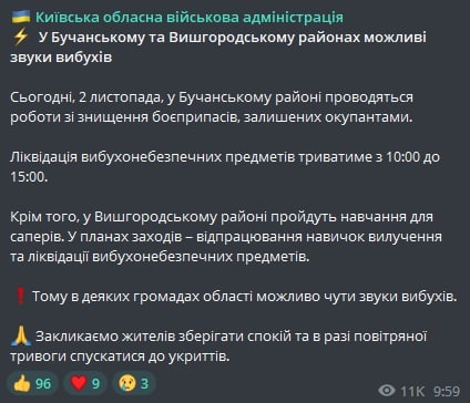 10:21 Сегодня в Бучанском и Вышгородском районах Киевской области могут быть слышны звуки взрывов.