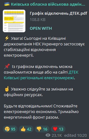 11:13 В Киевской области Укрэнерго применяет стабилизационные отключения, сообщает Киевская областная военная администрация.