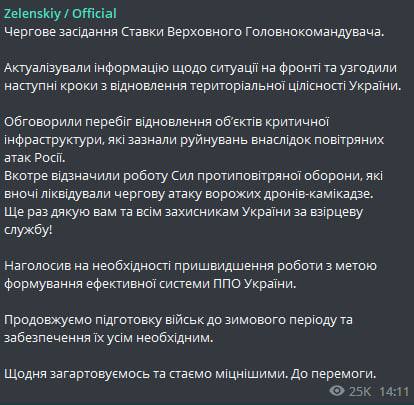 • Сообщил о новом заседании ставки верховного главнокомандующего, где обсуждались сражения на Донбассе и других направлениях.