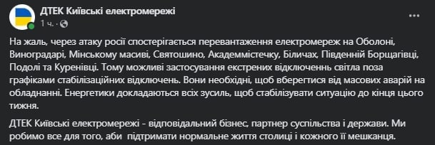 11.40 В ряде областей вводят отключения света, сообщают в Офисе президента.