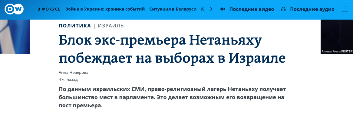 На досрочных парламентских выборах в Израиле побеждает блок правых партий под руководством бывшего премьер-министра Биньямина Нетаньяху. По результатам обработки 97% бюллетеней блок Нетаньяху получает большинство мест в кнессете - 65 из 120.