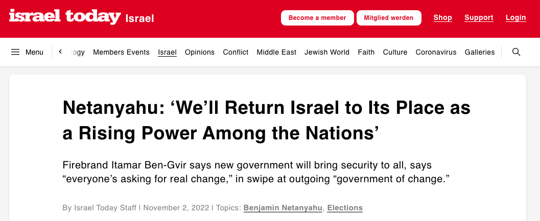 "Еще раз стало ясно, что "Ликуд" является крупнейшей партией в Израиле, с большим отрывом выше всех других партий. Нация хочет другого пути. Она хочет безопасности. Она хочет снизить стоимость жизни. Она хочет силы. Она не хочет стыда. Она хочет вернуть национальную гордость, которую у нас отняли. И это мы тоже привезем", - заявил Нетаньяху и пообещал "расширить круг мира".