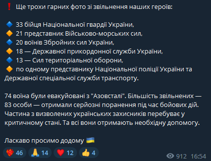 Ранее глава Офиса президента Андрей Ермак в своем тг-канале также опубликовал фото и видео сегодняшнего обмена пленными 107 на 107. По его словам, освобождены 6 офицеров, 101 рядовой и сержант. 74 бойца из освобожденных защищали "Азовсталь", в том числе три бойца полка "Азов".