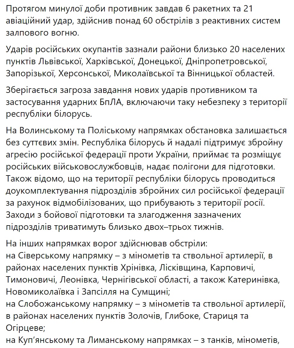 - За прошедшие сутки противник нанес 6 ракетных и 21 авиационный удар, совершил более 60 обстрелов из реактивных систем залпового огня.