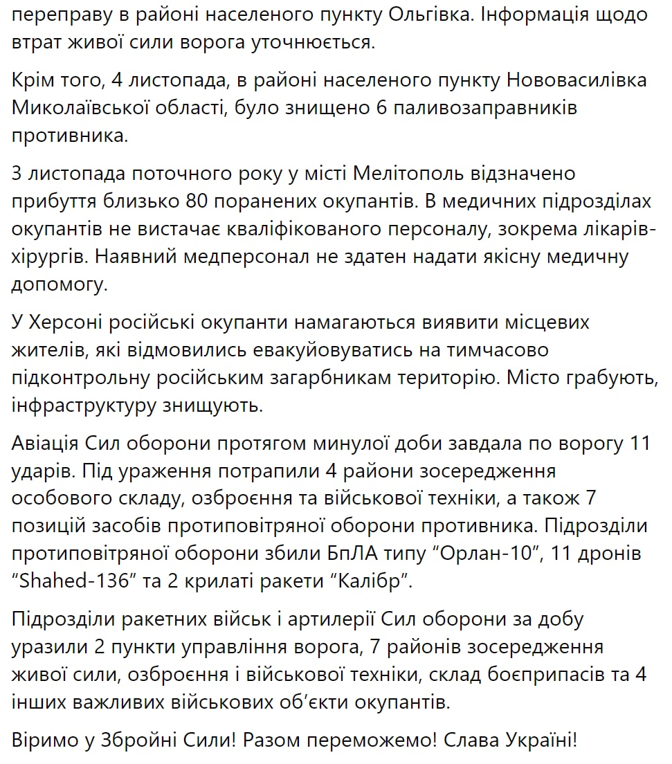 В Генштабе ВСУ опубликовали оперативную сводку с фронта по состоянию на 06:00 5 ноября. Сообщается, что российские войска наступают под Бахмутом, Авдеевкой и Новопавловкой.