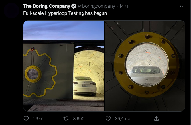 Компания Маска заявила о полномасштабных испытаниях Hyperloop. Фото: Твиттер