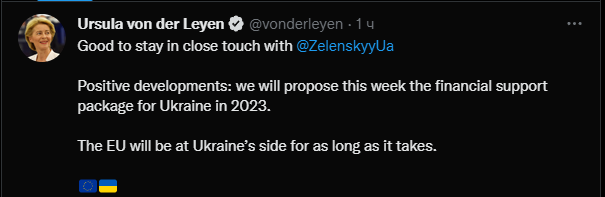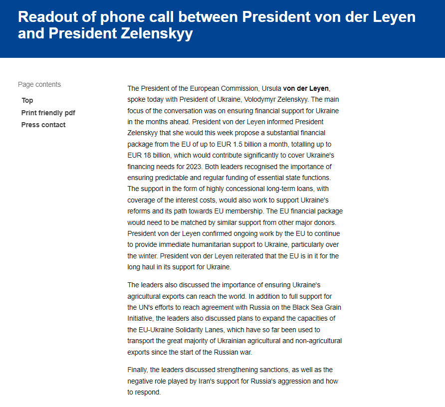 "Председатель Еврокомиссии фон дер Ляйен проинформировала президента Зеленского, что на предстоящей неделе она представит план значительной финансовой помощи со стороны ЕС в размере до 1,5 млрд евро, что в целом составит до 18 млрд евро на покрытие первоочередных потребностей Украины в 2023 году. Помощь будет предоставлена в виде очень льготных долгосрочных кредитов и будет способствовать реформам на Украине, необходимым на пути к вступлению в ЕС", — говорится в заявлении ЕК.