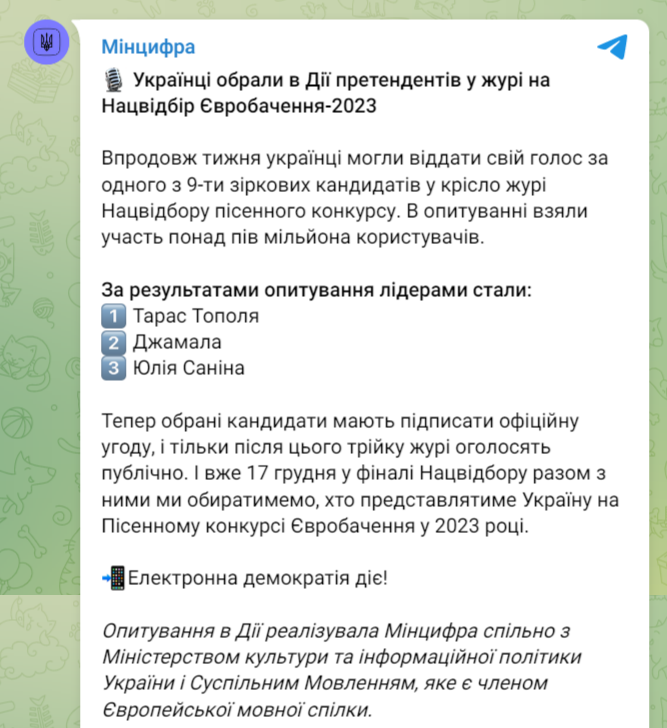 Украинцы выбрали в приложении "Дия" претендентов в жюри на Нацотбор Евровидения-2023. В течение недели украинцы могли отдать свой голос за одного из 9 звездных кандидатов в кресло жюри Нацотбора песенного конкурса. В опросе приняло участие более полумиллиона пользователей.