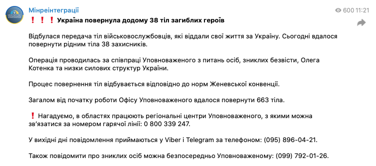 Украина вернула домой тела 38 погибших военных. Об этом сообщает пресс-служба Минреинтеграции.