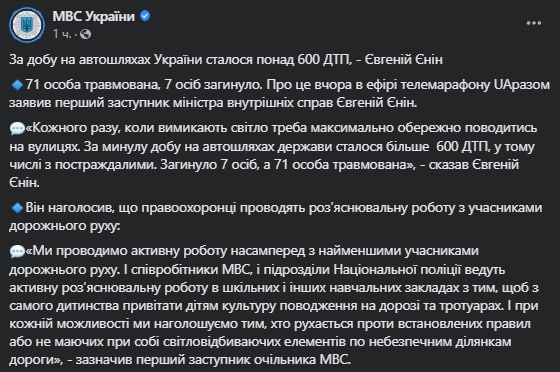 На фоне отключений светофоров и уличного освещения в Украине растет статистика по ДТП. За сутки на дорогах Украины случились более 600 аварий, 71 человек травмировался, 7 человек погибли, заявил замминистра внутренних дел Евгений Енин.