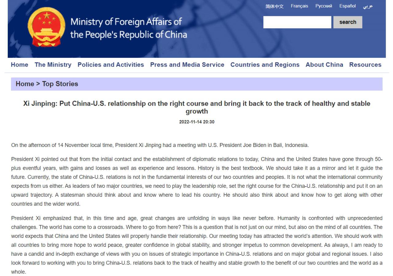МИД Китая опубликовал свой пресс-релиз по итогам первой встречи Си Цзиньпиня и Джо Байдена. В нем также говорится о важности развития двухсторонних отношений США и Китая как ведущих мировых государств и упоминается тема войны в Украине.
