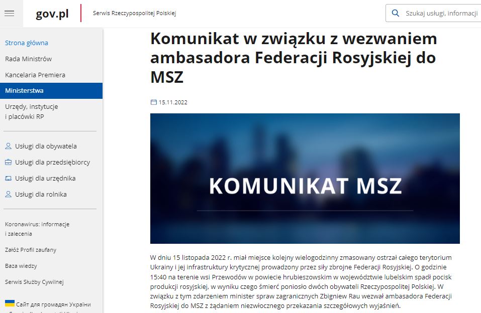 В 15:40 в селе Пшеводов Люблинского воеводства упала ракета российского производства, в результате чего погибли двое граждан Республики Польша. В связи с этим событием министр иностранных дел Збигнев Рау вызвал посла Российской Федерации в МИД и потребовал немедленных подробных объяснений" - говорится в сообщении на сайте МИДа.