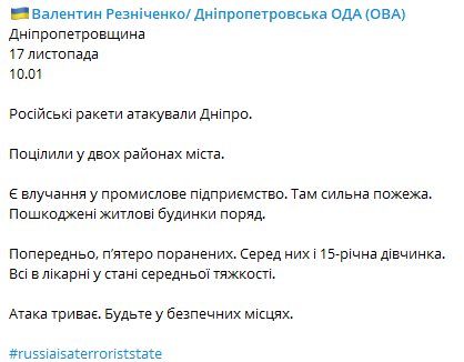 "Есть попадание в промышленное предприятие. Там сильный пожар. Повреждены жилые дома рядом. Предварительно, пятеро раненых. В их числе и 15-летняя девочка. Все в больнице в состоянии средней тяжести. Атака продолжается. Будьте в безопасных местах", - написал он у себя в телеграм-канале.