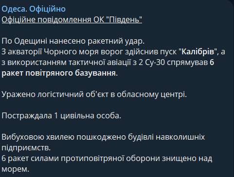 Сообщается, что был поражен объект логистики в самой Одессе. По нему били "Калибры" и шесть ракет воздушного базирования.