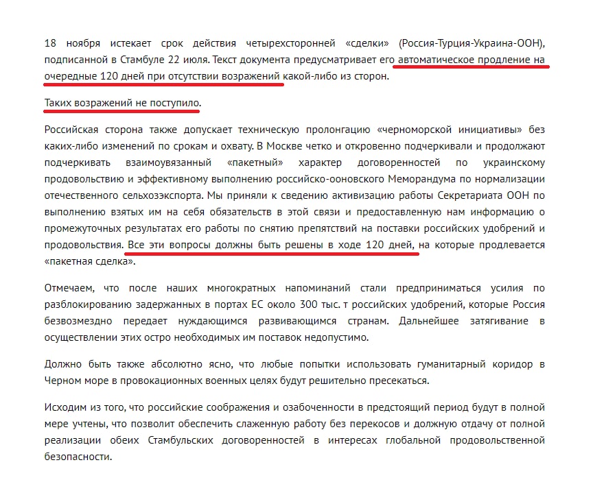 Вместе с тем он предупреждает, что за эти 120 дней должны быть снятые препятствия для экспорта российского продовольствия и удобрений.