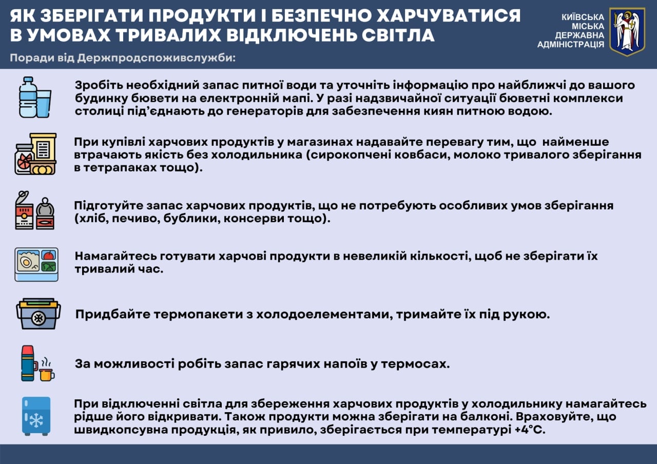 Управление Госпотребслужбы Киева разъясняет, как хранить продукты и безопасно питаться во время длительных отключений света.
