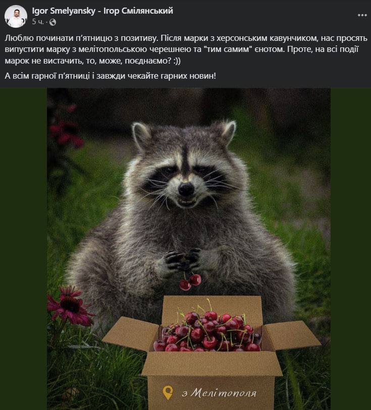 Глава Укрпошты Игорь Смелянский анонсировал марку с енотом из зоопарка Херсона, которого россияне вывезли в Крым при отступлении.