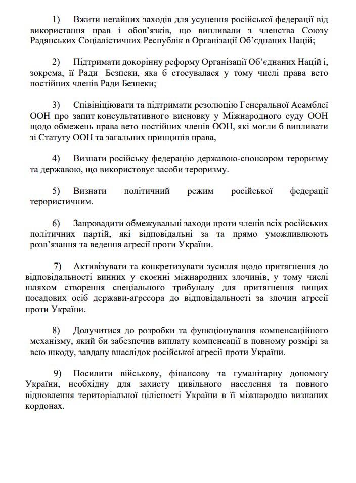 В нем, в частности, мировые парламенты призывают "принять меры для немедленного отстранения российской федерации (правописание согласно с оригиналом проекта - Ред.) от использования прав и обязанностей, которые проистекали из членства СССР в ООН".