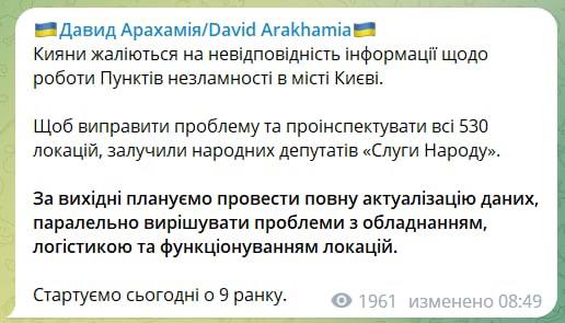 "Чтобы исправить проблему и проинспектировать все 530 локаций привлекли народных депутатов "Слуги Народа". В выходные планируем провести полную актуализацию данных, параллельно решать проблемы с оборудованием, логистикой и функционированием локаций", - обещает Арахамия.