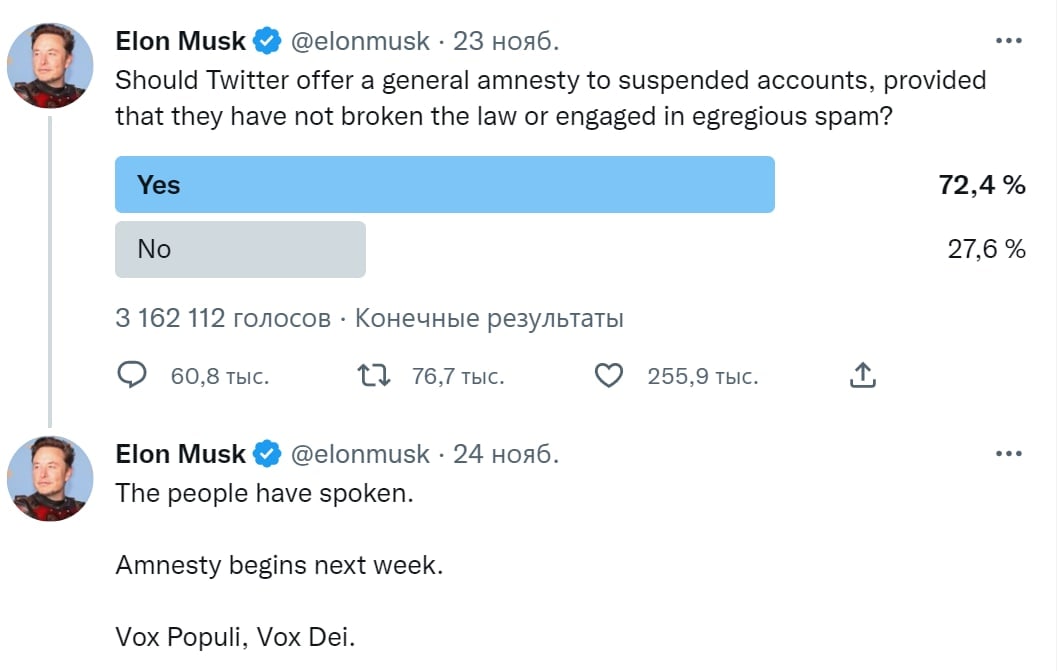 К такому решению его подтолкнули результаты опроса, проведенного в Твиттере. 72.4% его участников высказались за амнистию.