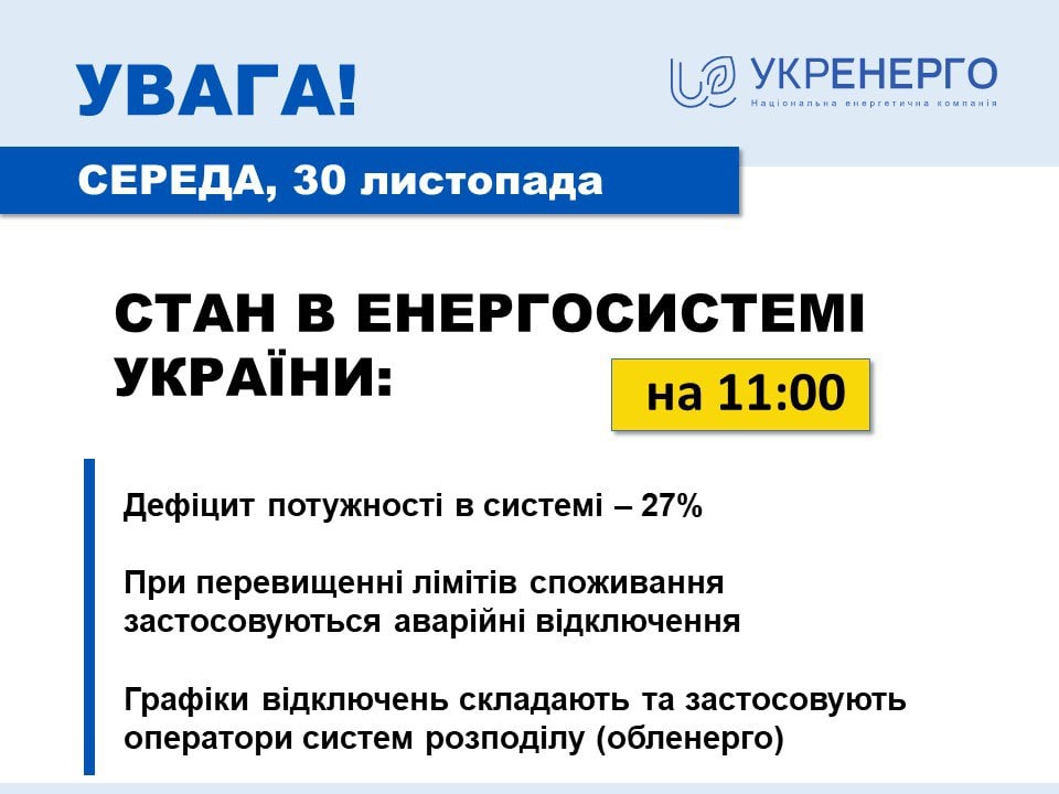 11.20 Дефицит в энергосистеме Украины на это утро - 27%, сообщает "Укрэнерго". При превышении отпущенных на области лимитов, будут применяться аварийные отключения света.