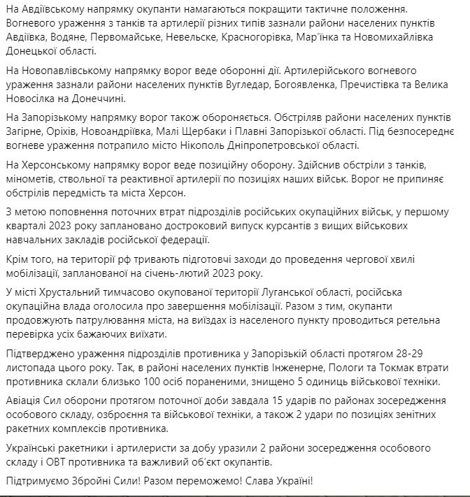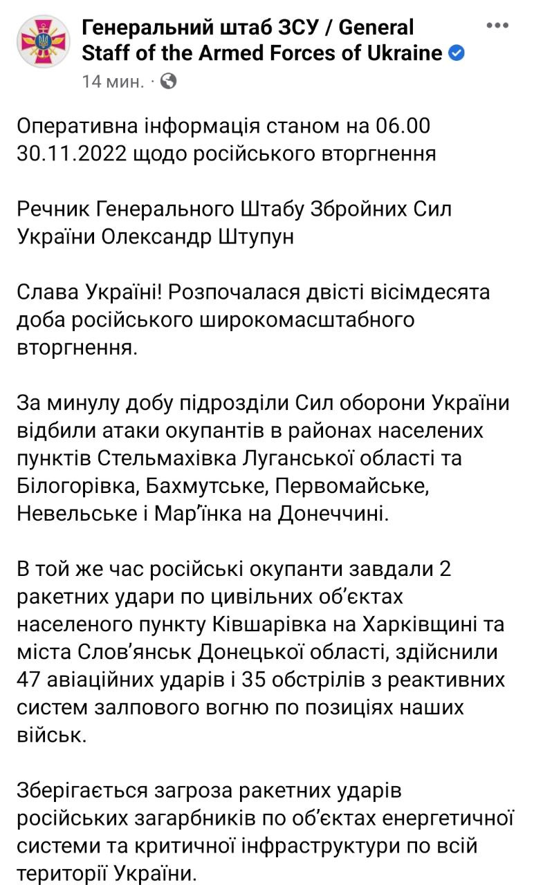В среду, 30 ноября, в Украине идет уже 280-й день войны с РФ.