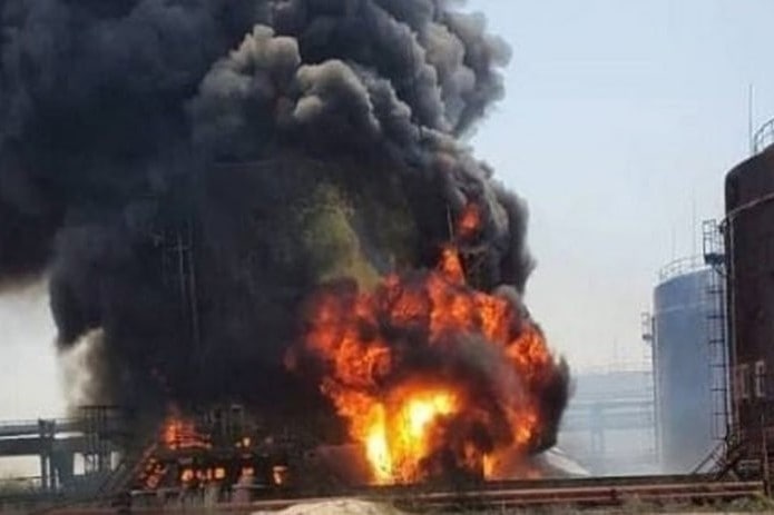 09.31 Еще фото пожара на нефтебазе в Брянской области, где, по данным российских СМИ, был удар беспилотника.