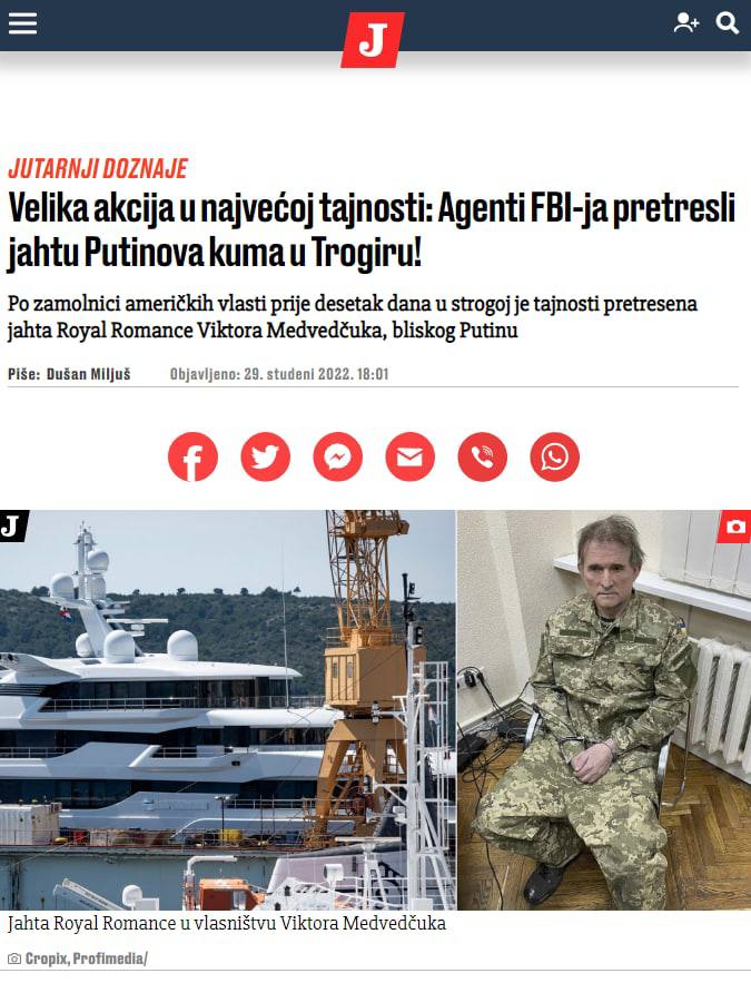 ФБР США обыскало яхту Виктора Медведчука в Хорватии, пишет хорватская газета Jutarnji List.